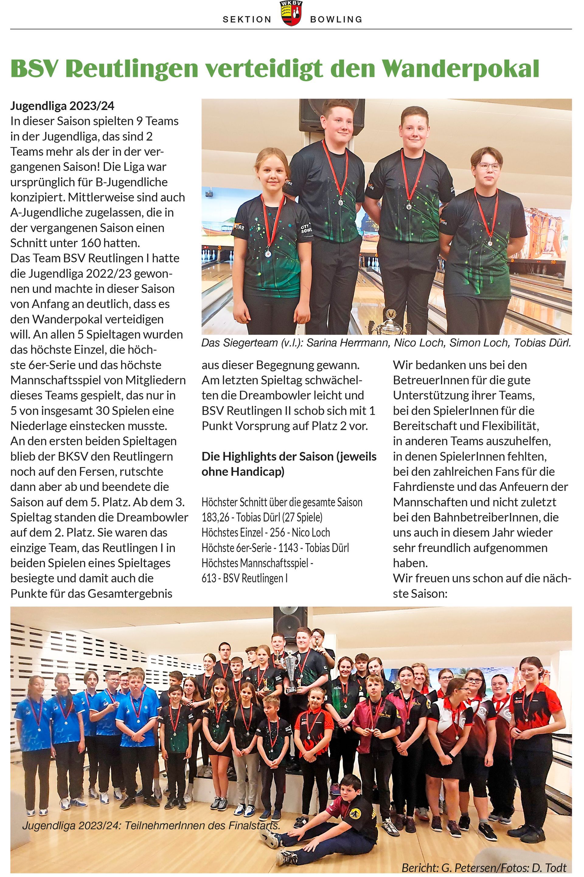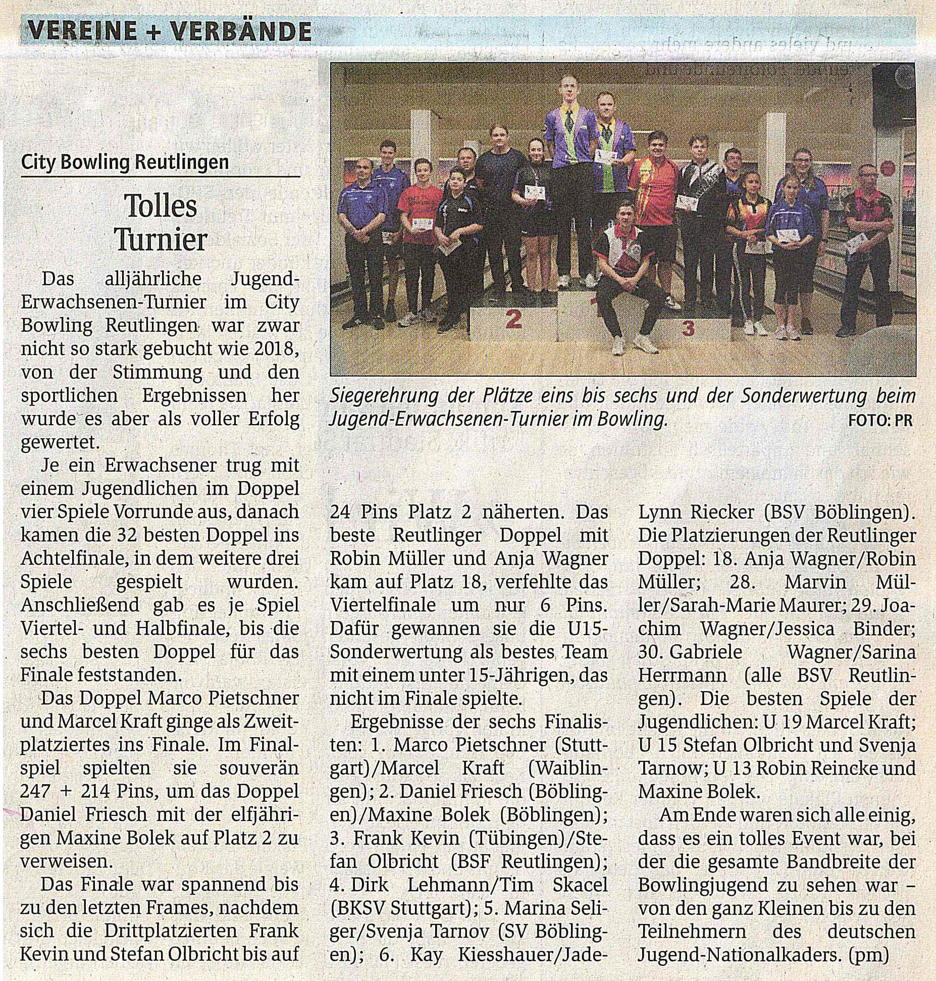 Sieger der Sonderwertung mit einem Jugendlichen unter 15 Jahre war ein Viernheimer Doppel und die Sonderwertung mit einem Jugendlichen unter 13 Jahren gewann ein Böblinger Doppel. Das beste Spiel eines Erwachsenen war das „perfekte Spiel“ mit 300 Pins, das beste Spiel eines Jugendlichen war 258 Pins.